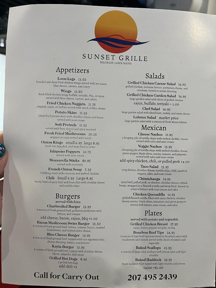 Welcome to Sunset Grill, your go-to spot in Belgrade Lakes for a delightful dining experience. Located at 1214 West Rd, we offer a cozy atmosphere perfect for breakfast, lunch, or dinner. Enjoy our extensive menu featuring excellent coffee, handcrafted cocktails, and delectable desserts, all at an affordable price range of $10-20. With amenities like outdoor seating, takeout, and delivery, we cater to all your dining preferences. Join us for happy hour specials or catch your favorite sports events in a relaxed setting. Our accessible facilities ensure everyone can enjoy their time with us. Visit Sunset Grill today!